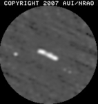 • JPEG shows a thumbnail of the pipeline image. Clicking it will show you a larger version in the browser. Both JPEG images have a square transfer function to emphasize the lower levels a bit more; do not use the JPEGs for scientific purposes (see next). As a guideline, the lighter a thumbnail, the less difference between the peak flux density and the rms noise level, i.e., don't expect to see too much in in light gray images, especially if the rms noise given in the next column is in the order of microJy or less. On the other hand, dark images have a strong source in there somewhere.. (try looking in the center of the image).