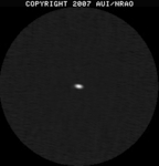 • JPEG shows a thumbnail of the pipeline image. Clicking it will show you a larger version in the browser. Both JPEG images have a square transfer function to emphasize the lower levels a bit more; do not use the JPEGs for scientific purposes (see next). As a guideline, the lighter a thumbnail, the less difference between the peak flux density and the rms noise level, i.e., don't expect to see too much in in light gray images, especially if the rms noise given in the next column is in the order of microJy or less. On the other hand, dark images have a strong source in there somewhere.. (try looking in the center of the image).