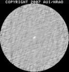 • JPEG shows a thumbnail of the pipeline image. Clicking it will show you a larger version in the browser. Both JPEG images have a square transfer function to emphasize the lower levels a bit more; do not use the JPEGs for scientific purposes (see next). As a guideline, the lighter a thumbnail, the less difference between the peak flux density and the rms noise level, i.e., don't expect to see too much in in light gray images, especially if the rms noise given in the next column is in the order of microJy or less. On the other hand, dark images have a strong source in there somewhere.. (try looking in the center of the image).