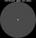 • JPEG shows a thumbnail of the pipeline image. Clicking it will show you a larger version in the browser. Both JPEG images have a square transfer function to emphasize the lower levels a bit more; do not use the JPEGs for scientific purposes (see next). As a guideline, the lighter a thumbnail, the less difference between the peak flux density and the rms noise level, i.e., don't expect to see too much in in light gray images, especially if the rms noise given in the next column is in the order of microJy or less. On the other hand, dark images have a strong source in there somewhere.. (try looking in the center of the image).