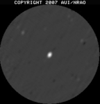 • JPEG shows a thumbnail of the pipeline image. Clicking it will show you a larger version in the browser. Both JPEG images have a square transfer function to emphasize the lower levels a bit more; do not use the JPEGs for scientific purposes (see next). As a guideline, the lighter a thumbnail, the less difference between the peak flux density and the rms noise level, i.e., don't expect to see too much in in light gray images, especially if the rms noise given in the next column is in the order of microJy or less. On the other hand, dark images have a strong source in there somewhere.. (try looking in the center of the image).