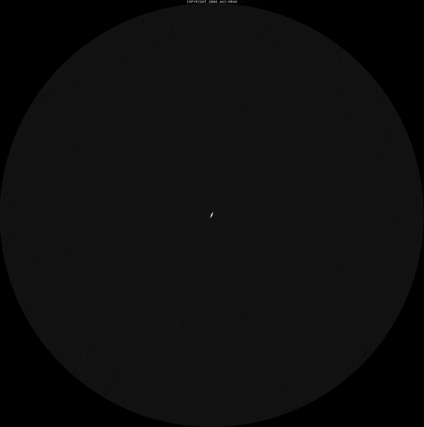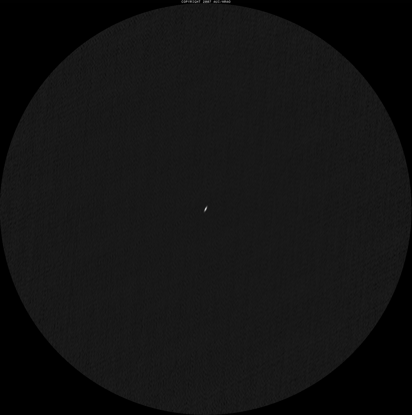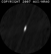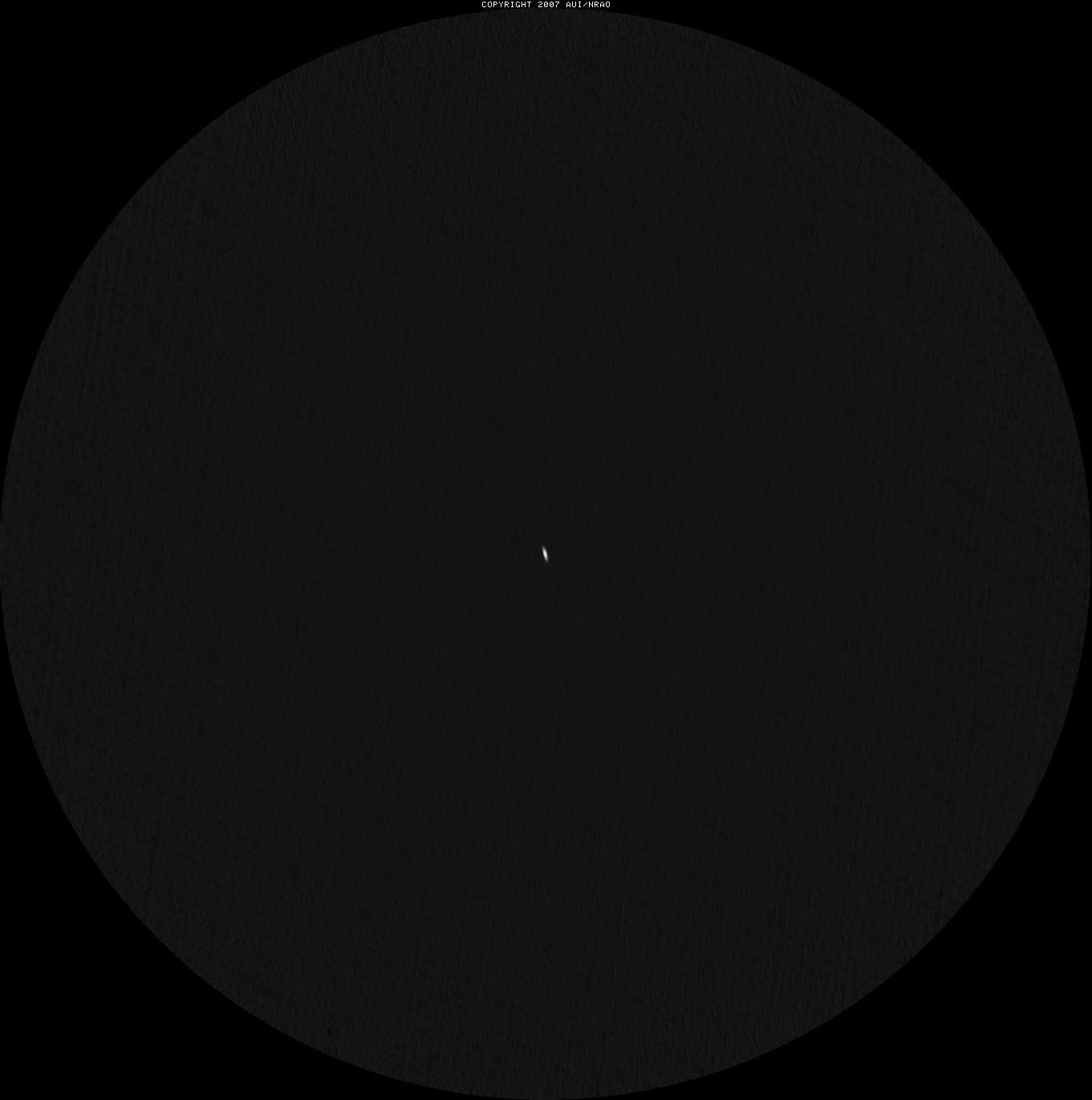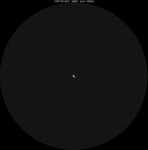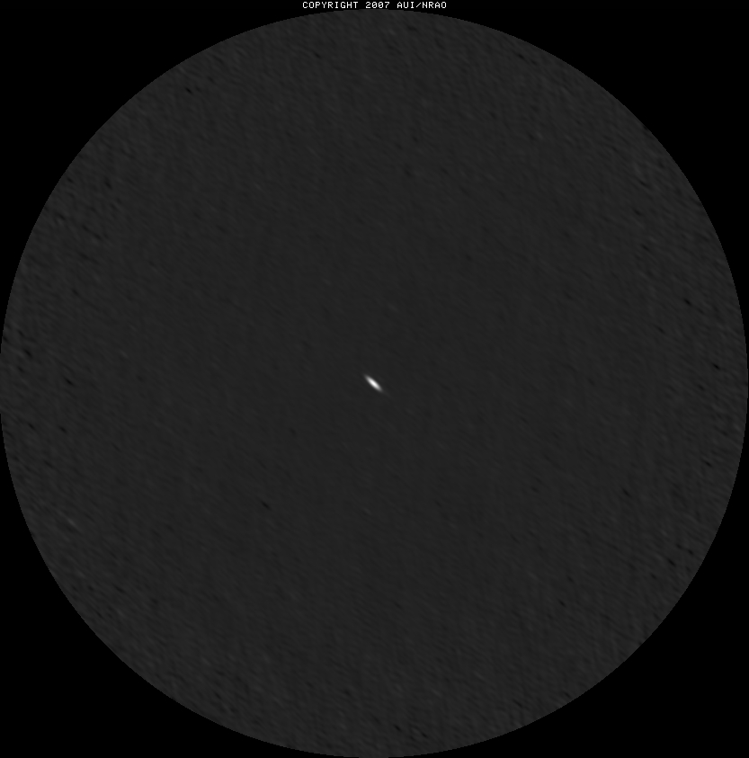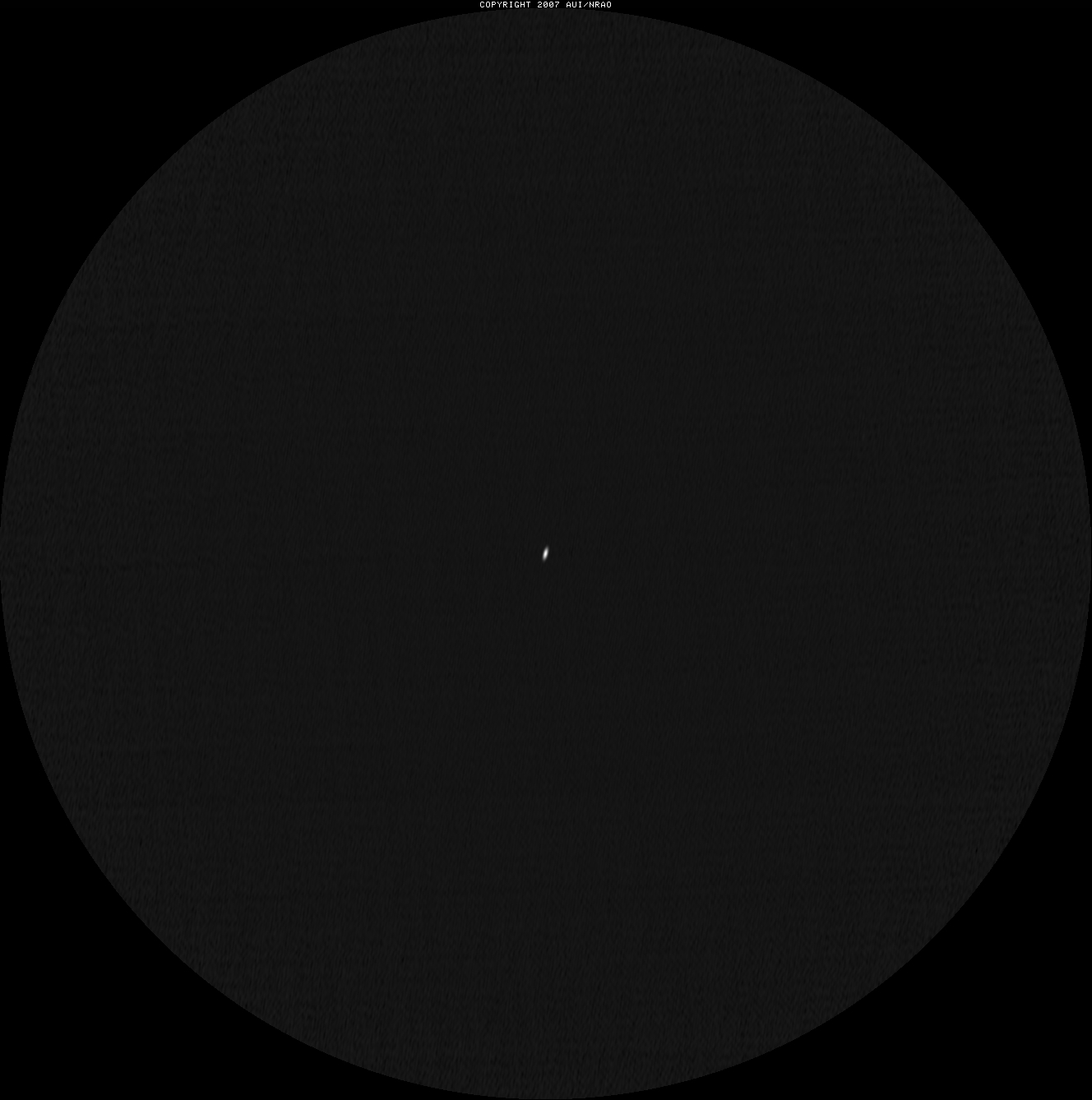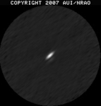 • JPEG shows a thumbnail of the pipeline image. Clicking it will show you a larger version in the browser. Both JPEG images have a square transfer function to emphasize the lower levels a bit more; do not use the JPEGs for scientific purposes (see next). As a guideline, the lighter a thumbnail, the less difference between the peak flux density and the rms noise level, i.e., don't expect to see too much in in light gray images, especially if the rms noise given in the next column is in the order of microJy or less. On the other hand, dark images have a strong source in there somewhere.. (try looking in the center of the image).