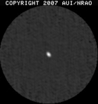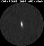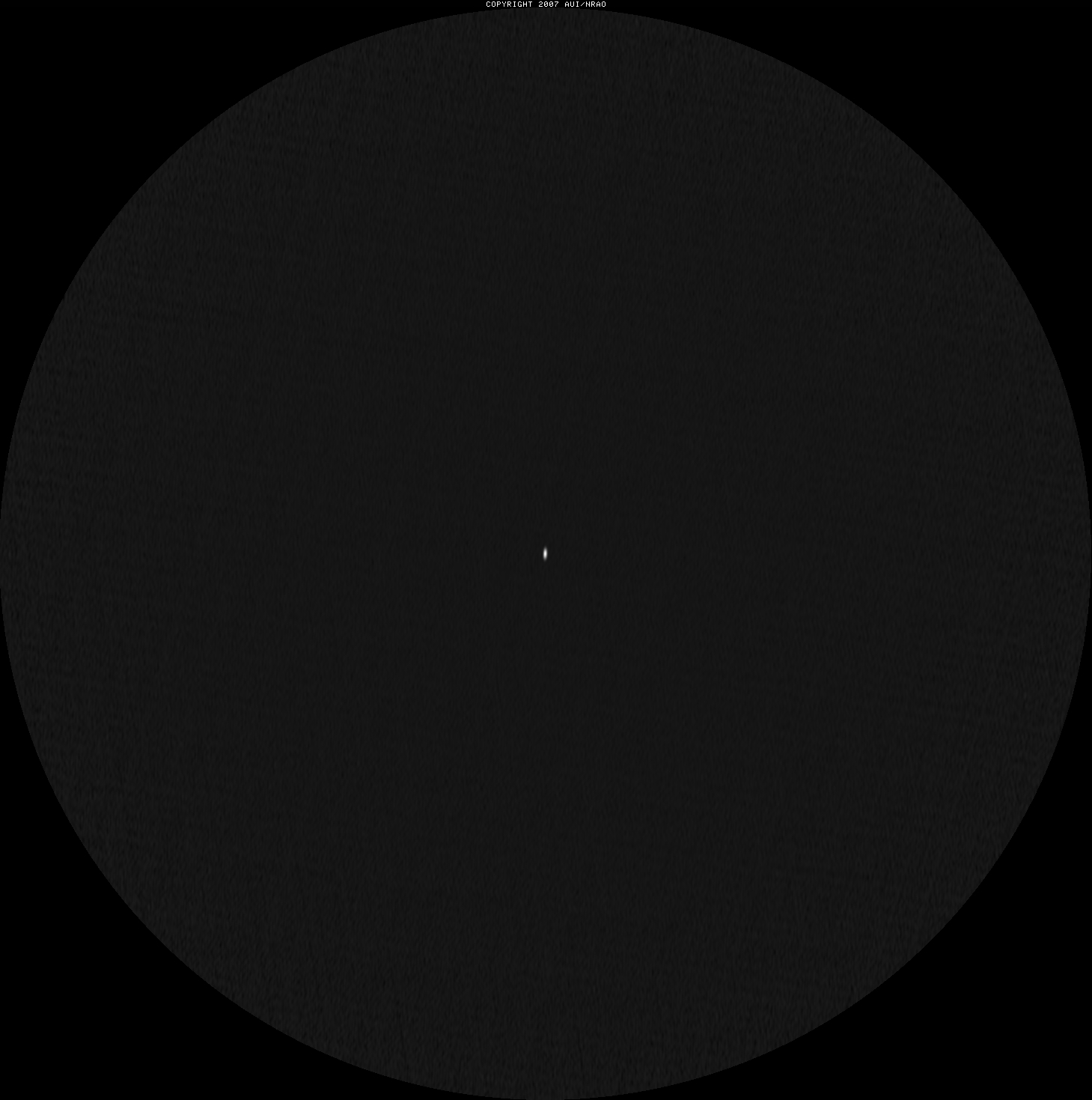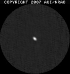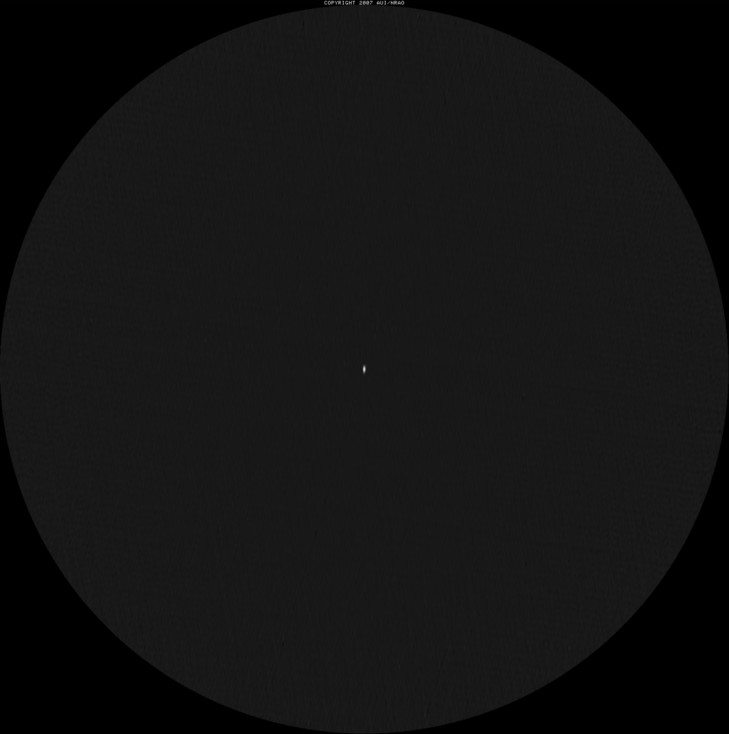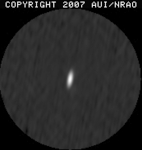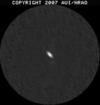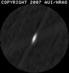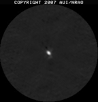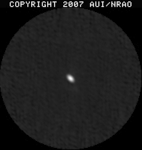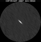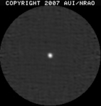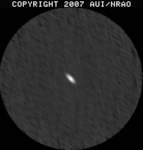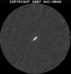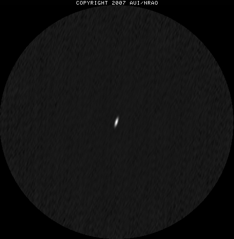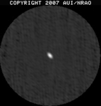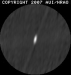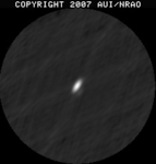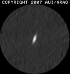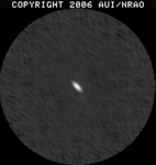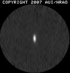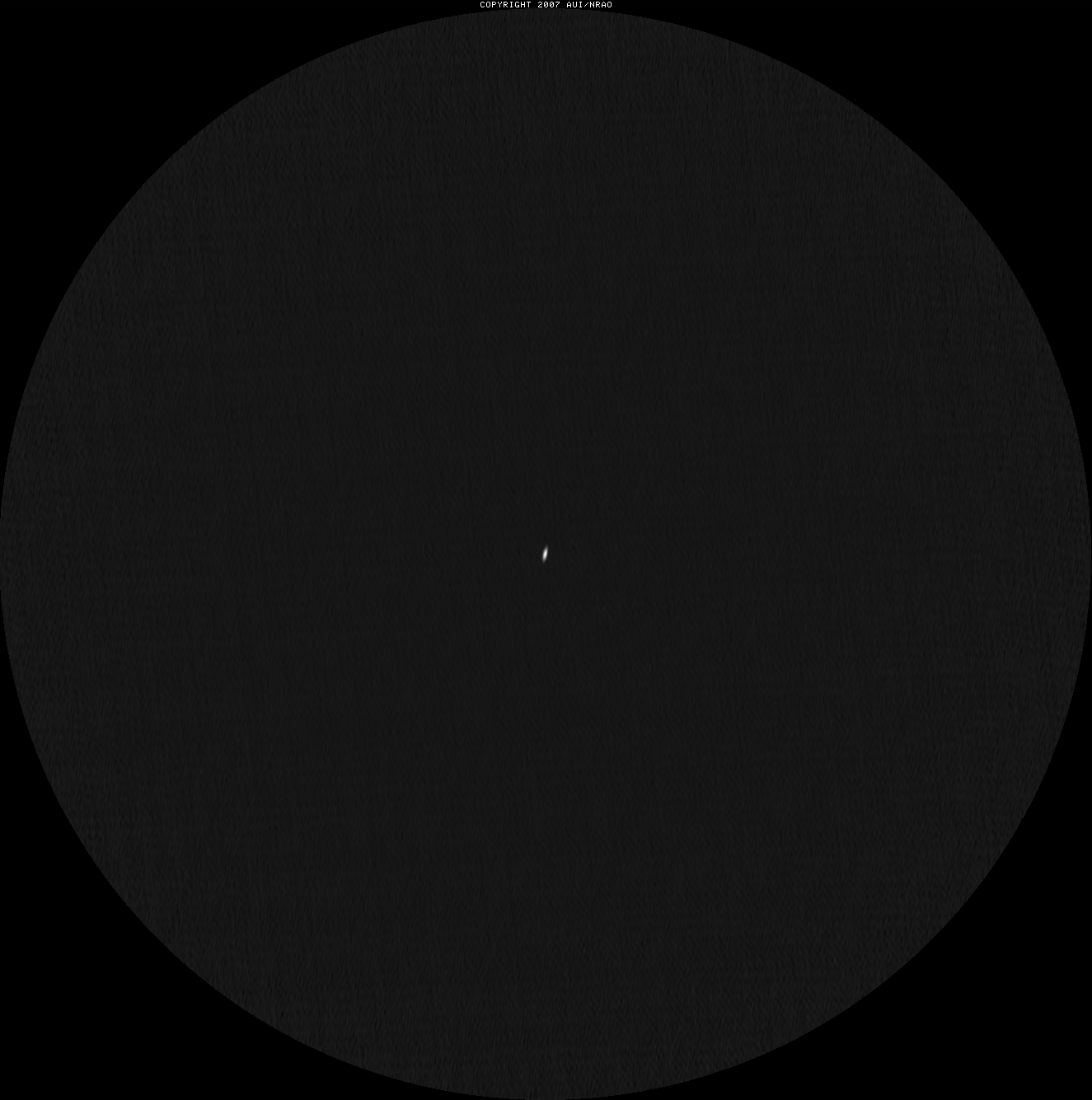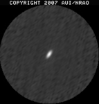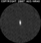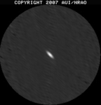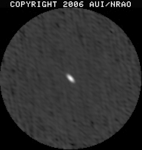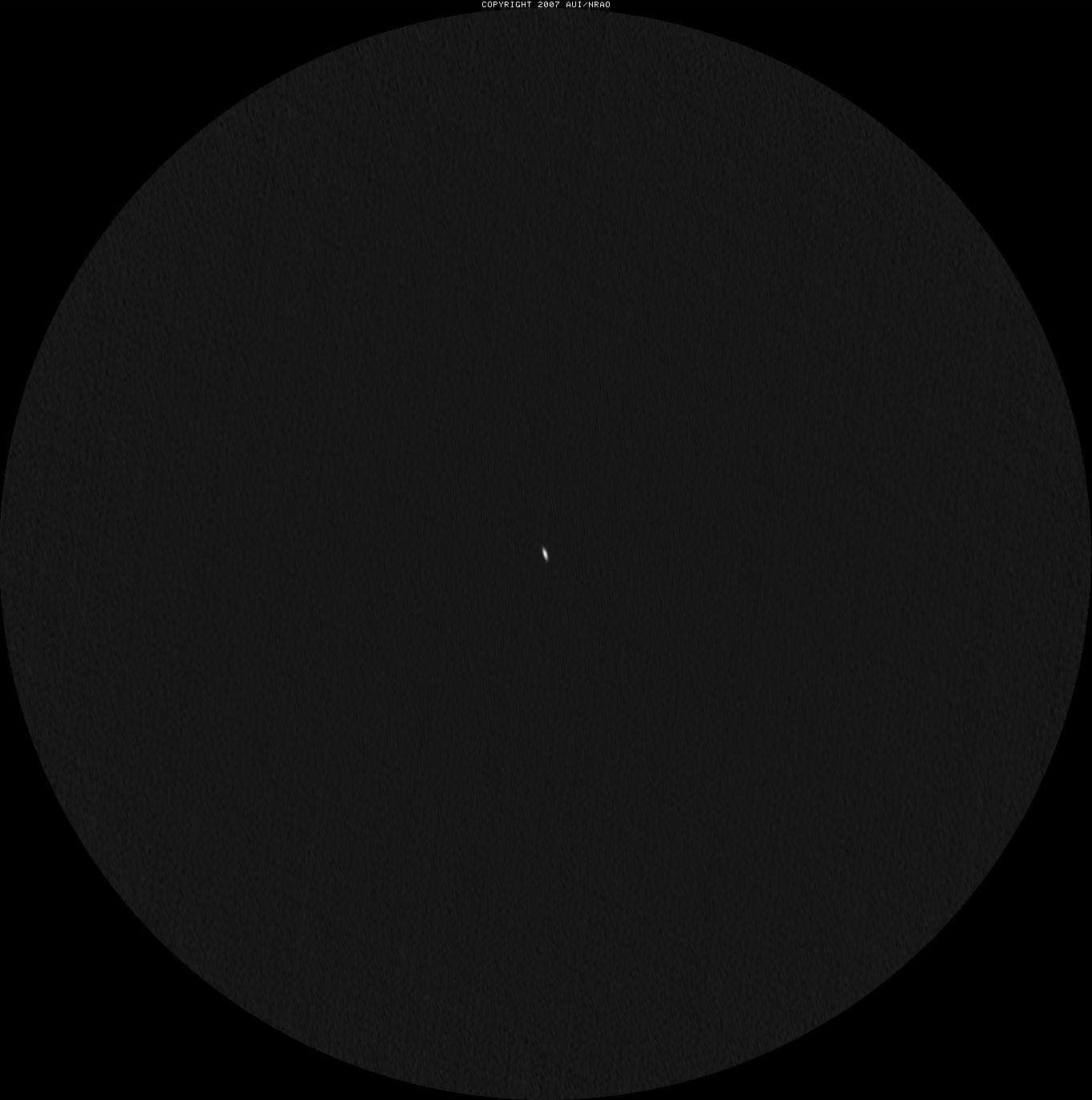 • JPEG shows a thumbnail of the pipeline image. Clicking it will show you a larger version in the browser. Both JPEG images have a square transfer function to emphasize the lower levels a bit more; do not use the JPEGs for scientific purposes (see next). As a guideline, the lighter a thumbnail, the less difference between the peak flux density and the rms noise level, i.e., don't expect to see too much in in light gray images, especially if the rms noise given in the next column is in the order of microJy or less. On the other hand, dark images have a strong source in there somewhere.. (try looking in the center of the image).