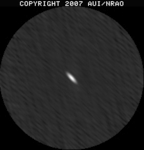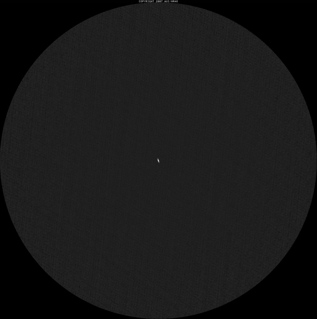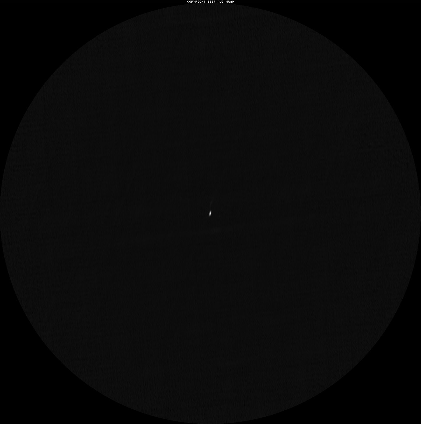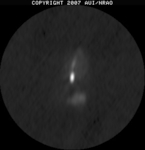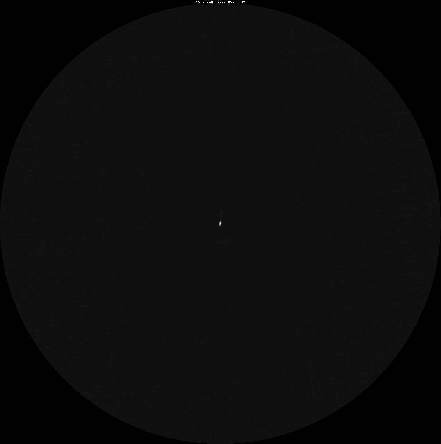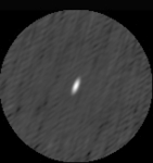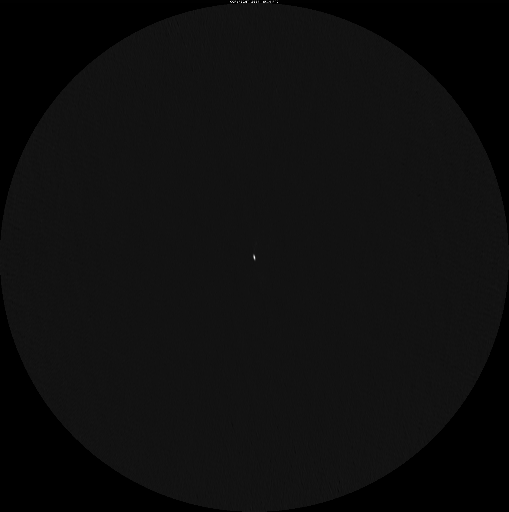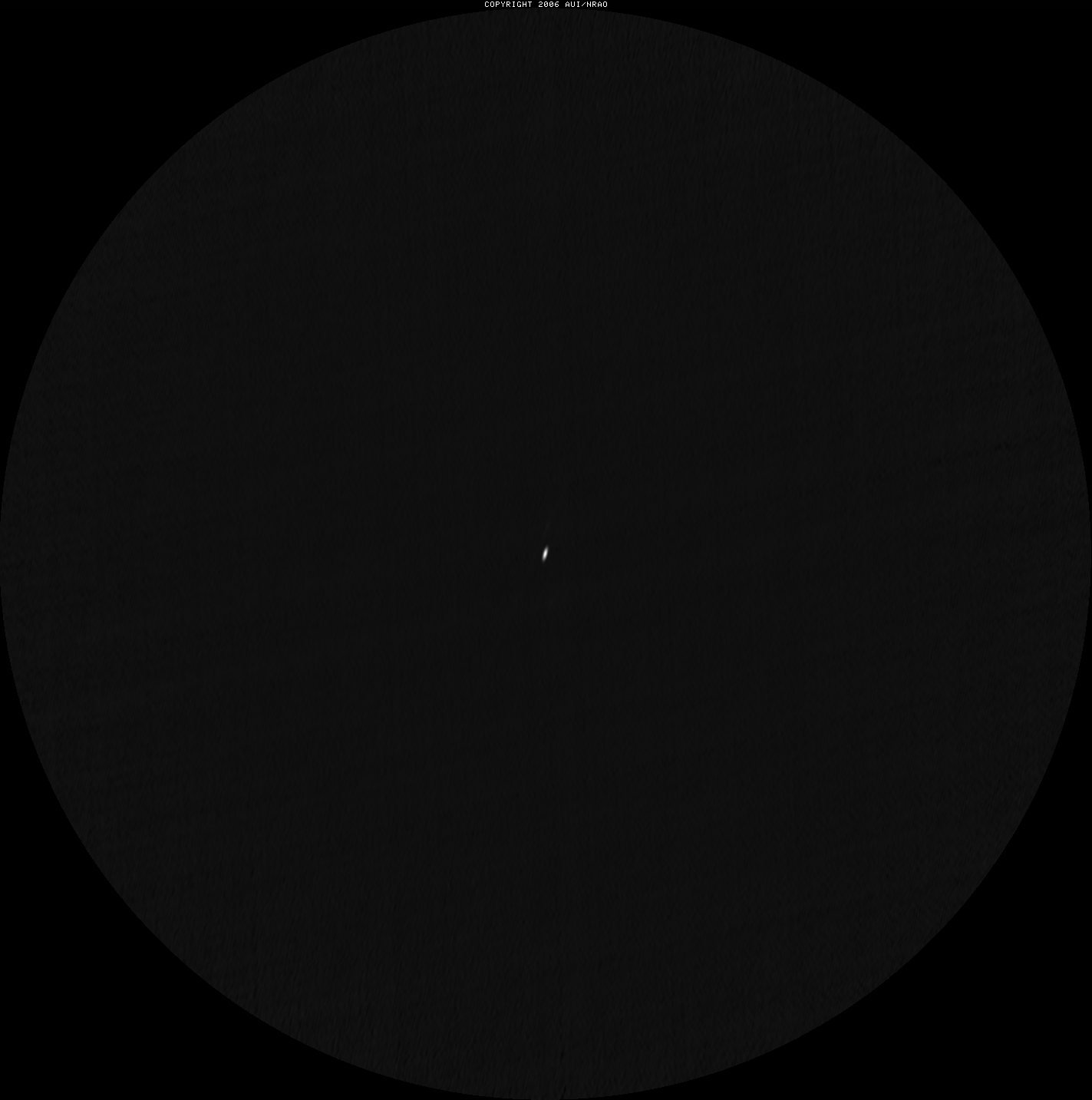 • JPEG shows a thumbnail of the pipeline image. Clicking it will show you a larger version in the browser. Both JPEG images have a square transfer function to emphasize the lower levels a bit more; do not use the JPEGs for scientific purposes (see next). As a guideline, the lighter a thumbnail, the less difference between the peak flux density and the rms noise level, i.e., don't expect to see too much in in light gray images, especially if the rms noise given in the next column is in the order of microJy or less. On the other hand, dark images have a strong source in there somewhere.. (try looking in the center of the image).