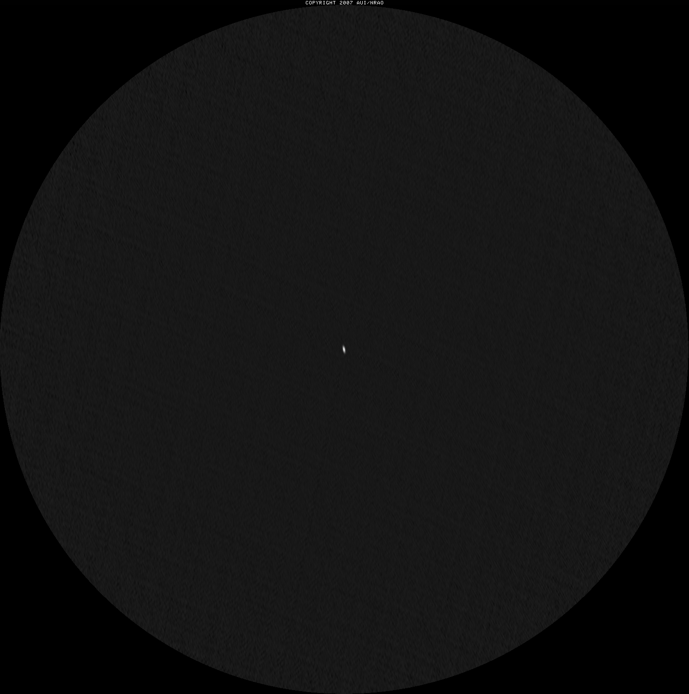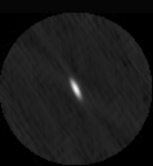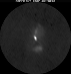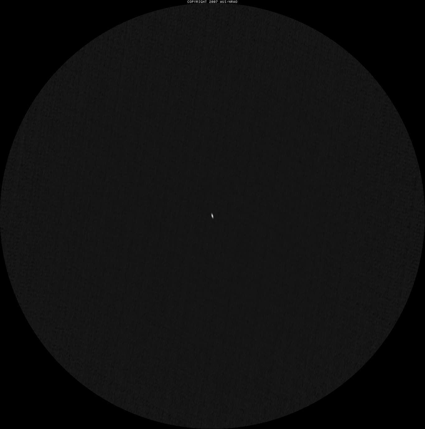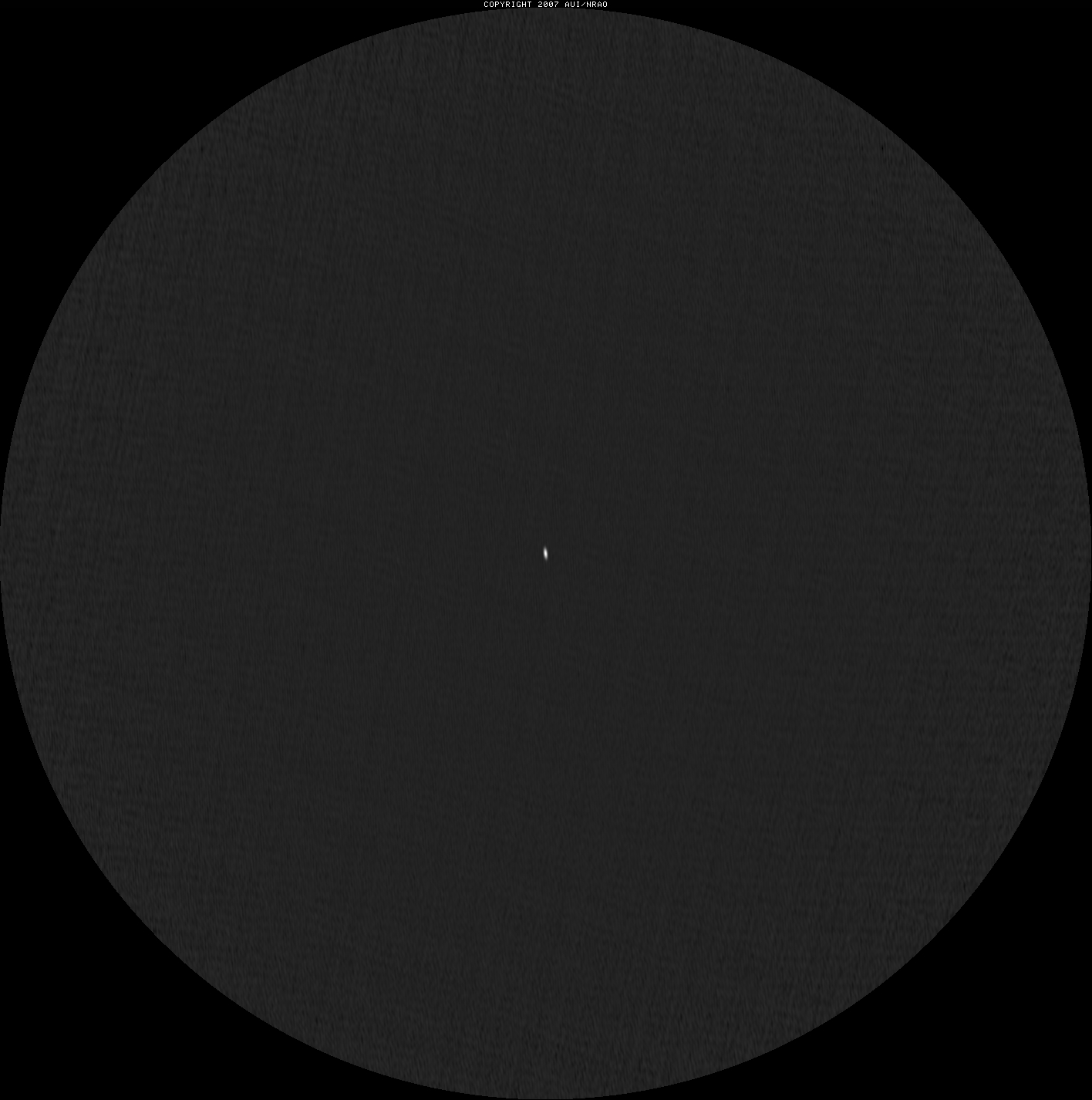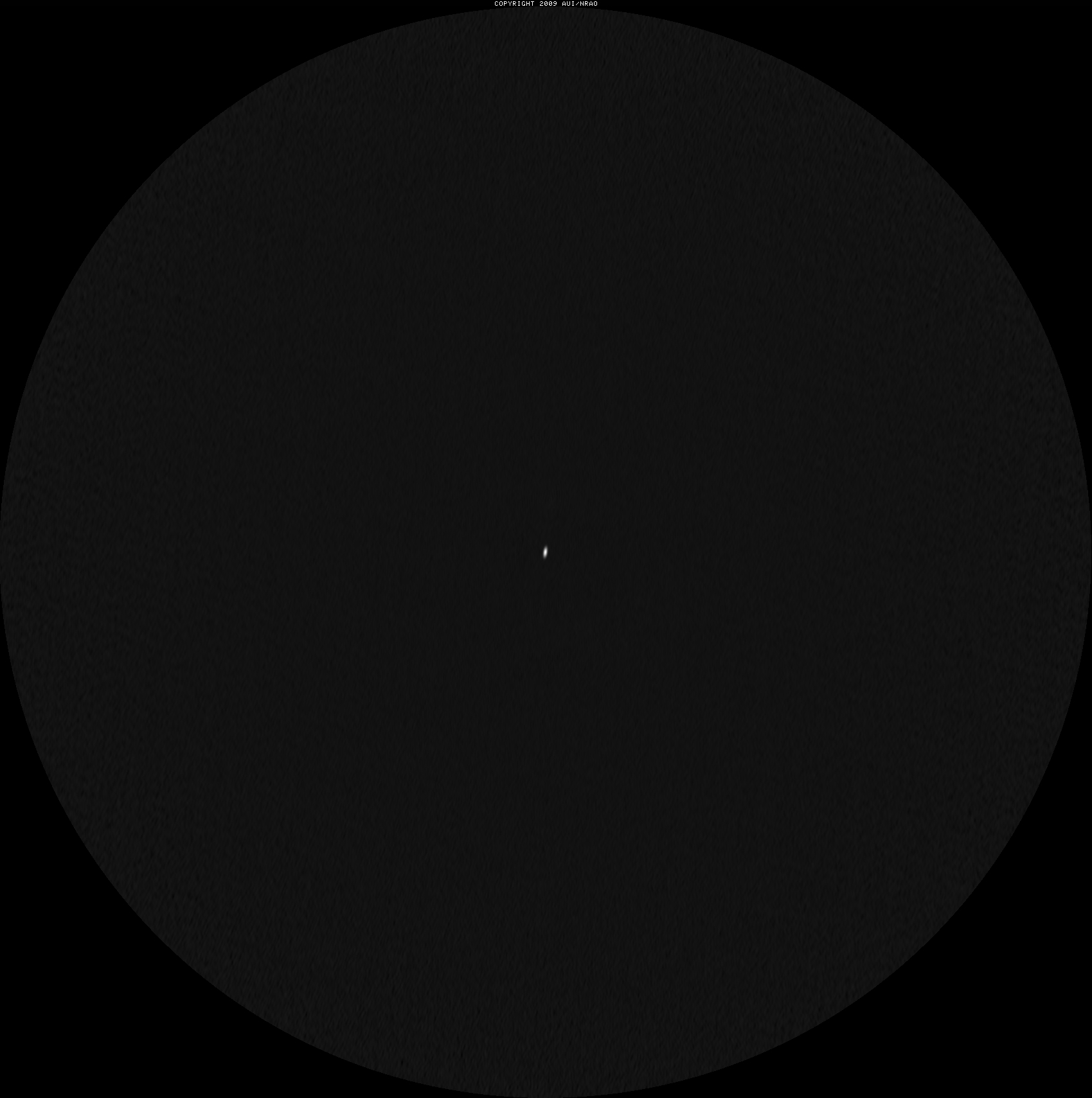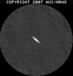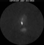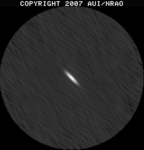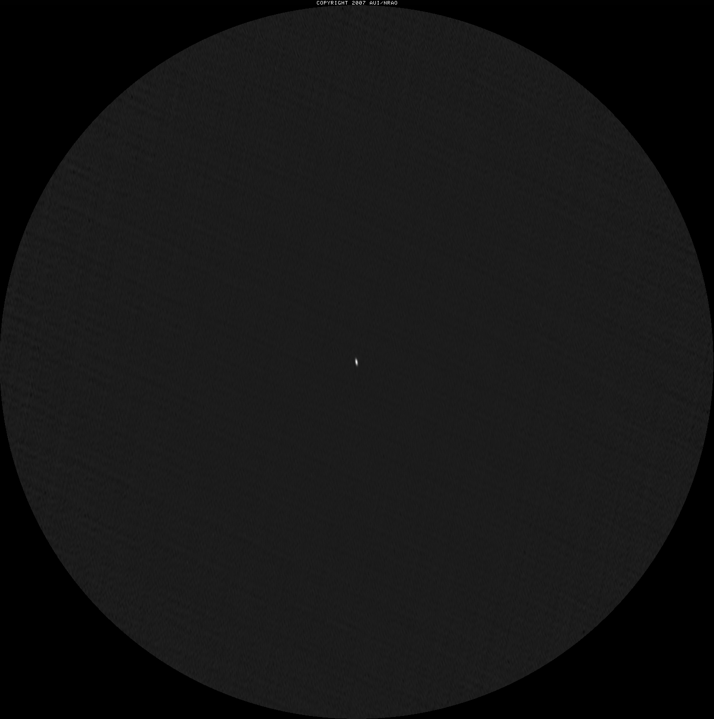 • JPEG shows a thumbnail of the pipeline image. Clicking it will show you a larger version in the browser. Both JPEG images have a square transfer function to emphasize the lower levels a bit more; do not use the JPEGs for scientific purposes (see next). As a guideline, the lighter a thumbnail, the less difference between the peak flux density and the rms noise level, i.e., don't expect to see too much in in light gray images, especially if the rms noise given in the next column is in the order of microJy or less. On the other hand, dark images have a strong source in there somewhere.. (try looking in the center of the image).