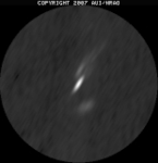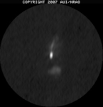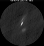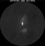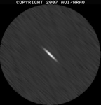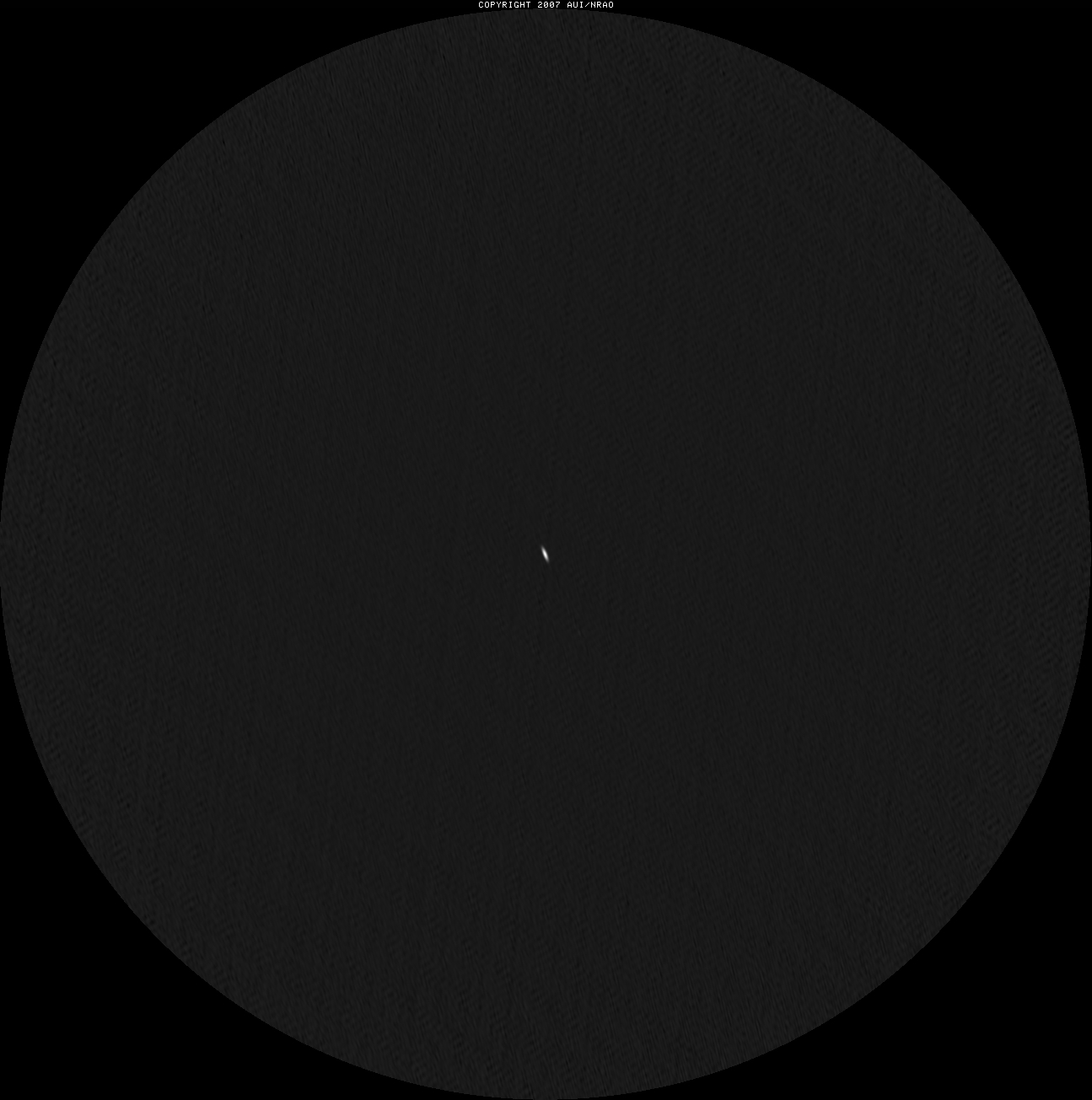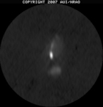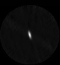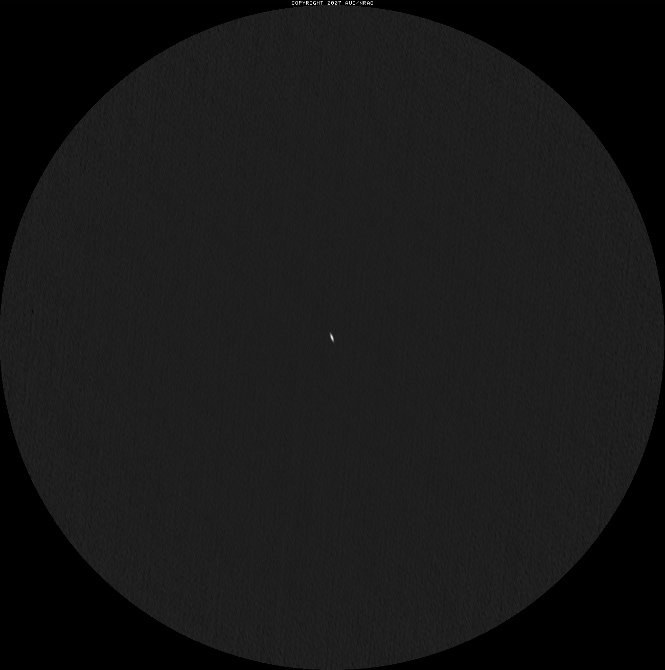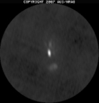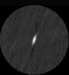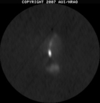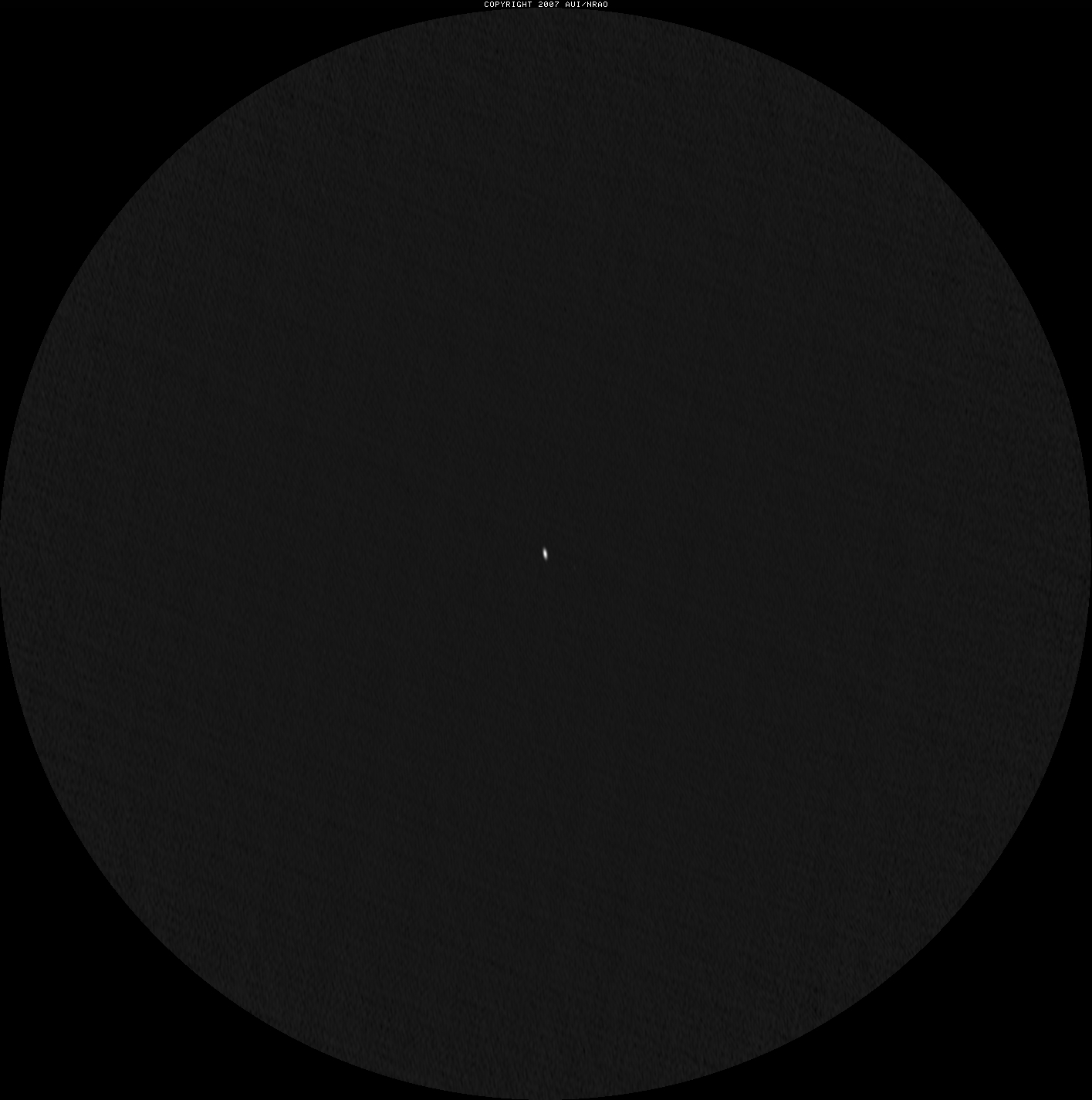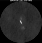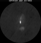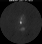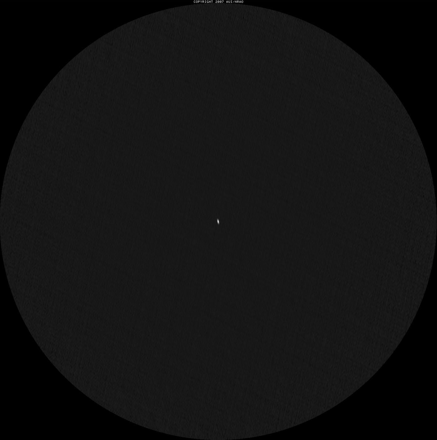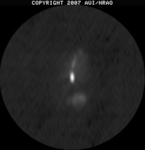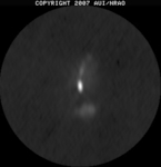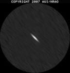 • JPEG shows a thumbnail of the pipeline image. Clicking it will show you a larger version in the browser. Both JPEG images have a square transfer function to emphasize the lower levels a bit more; do not use the JPEGs for scientific purposes (see next). As a guideline, the lighter a thumbnail, the less difference between the peak flux density and the rms noise level, i.e., don't expect to see too much in in light gray images, especially if the rms noise given in the next column is in the order of microJy or less. On the other hand, dark images have a strong source in there somewhere.. (try looking in the center of the image).