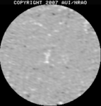 • JPEG shows a thumbnail of the pipeline image. Clicking it will show you a larger version in the browser. Both JPEG images have a square transfer function to emphasize the lower levels a bit more; do not use the JPEGs for scientific purposes (see next). As a guideline, the lighter a thumbnail, the less difference between the peak flux density and the rms noise level, i.e., don't expect to see too much in in light gray images, especially if the rms noise given in the next column is in the order of microJy or less. On the other hand, dark images have a strong source in there somewhere.. (try looking in the center of the image).