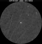 • JPEG shows a thumbnail of the pipeline image. Clicking it will show you a larger version in the browser. Both JPEG images have a square transfer function to emphasize the lower levels a bit more; do not use the JPEGs for scientific purposes (see next). As a guideline, the lighter a thumbnail, the less difference between the peak flux density and the rms noise level, i.e., don't expect to see too much in in light gray images, especially if the rms noise given in the next column is in the order of microJy or less. On the other hand, dark images have a strong source in there somewhere.. (try looking in the center of the image).