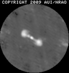 • JPEG shows a thumbnail of the pipeline image. Clicking it will show you a larger version in the browser. Both JPEG images have a square transfer function to emphasize the lower levels a bit more; do not use the JPEGs for scientific purposes (see next). As a guideline, the lighter a thumbnail, the less difference between the peak flux density and the rms noise level, i.e., don't expect to see too much in in light gray images, especially if the rms noise given in the next column is in the order of microJy or less. On the other hand, dark images have a strong source in there somewhere.. (try looking in the center of the image).
